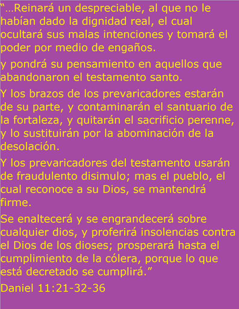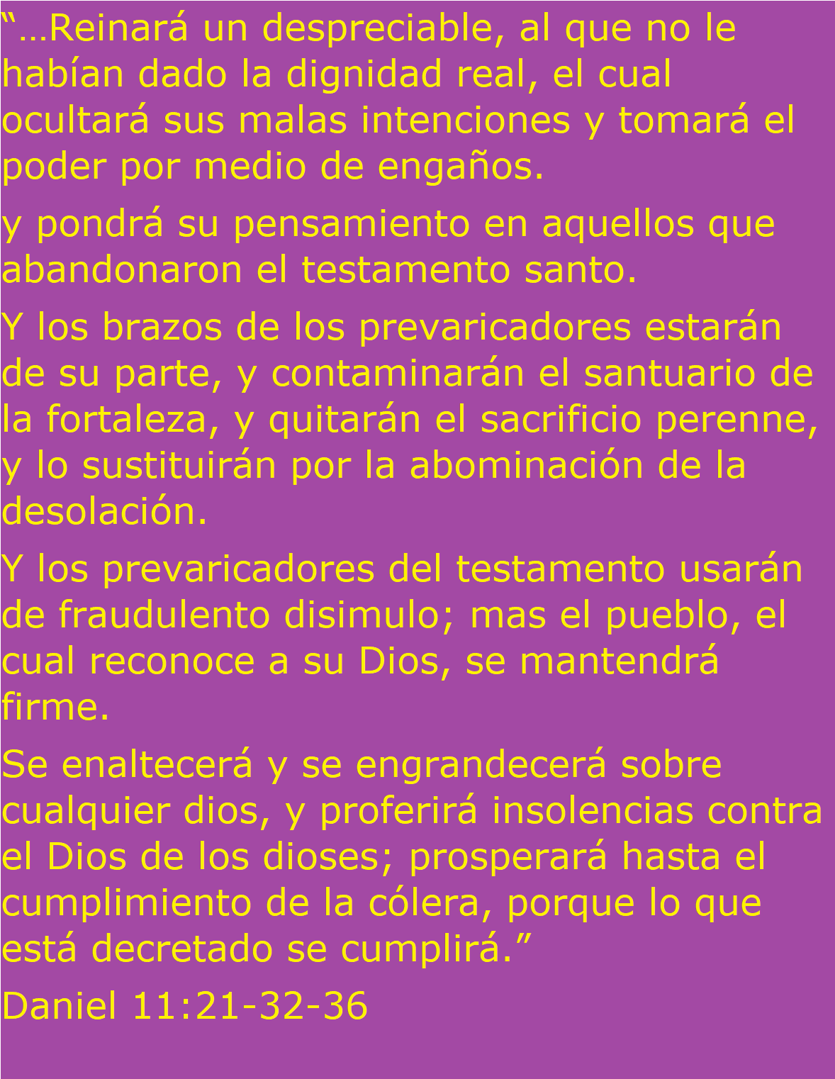 Se enaltecerá y se engrandecerá sobre cualquier dios, y proferirá insolencias contra el Dios de los dioses; prosperará hasta el cumplimiento de la cólera, porque lo que está decretado se cumplirá.” Daniel 11:21-32-36
