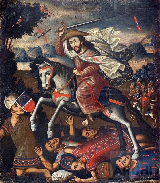 (…) en la conquista de México, ayuda a derrotar a Monctezuma. En el Tawantinsuyo les ayuda en la captura de Atahualpa; en el cerco del Cusco, efectuado por Manco Inca, en 1537, donde los españoles lloraban toda la noche ante el fuego devastador de los naturales, las aguas que inundaban la ciudad y la muerte segura, el apóstol aparece en el cielo montado sobre un caballo blanco blandiendo su espada y derrota a los tahuantinsuyanos. De esta suerte, Santiago Matamoros se convierte en “Santaigo Mata-indios” (Castro, 2000).