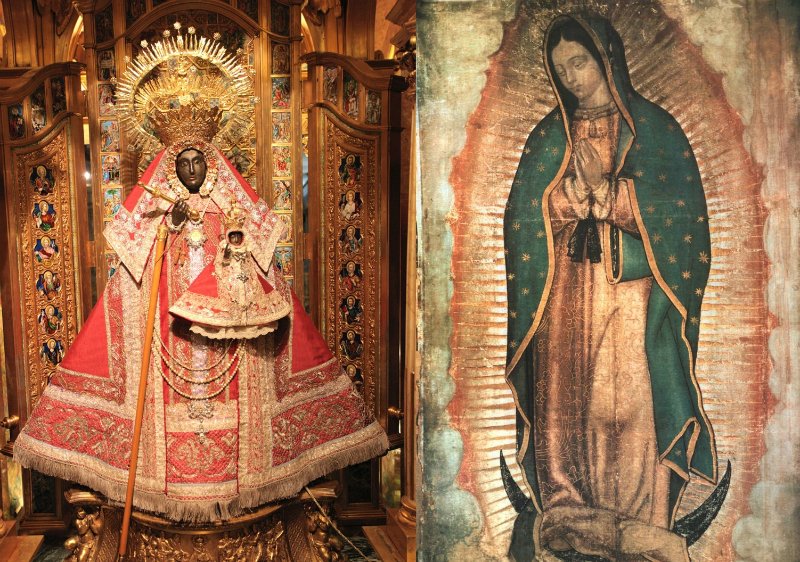 Muy diferente al lienzo del Tepeyac, no sólo por sus rasgos ibérico-bizantinos, sino además porque lleva al Niño Jesús en su brazo izquierdo; un cetro real en su mano derecha y una gran corona de oro sobre su cabeza.
