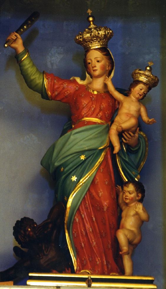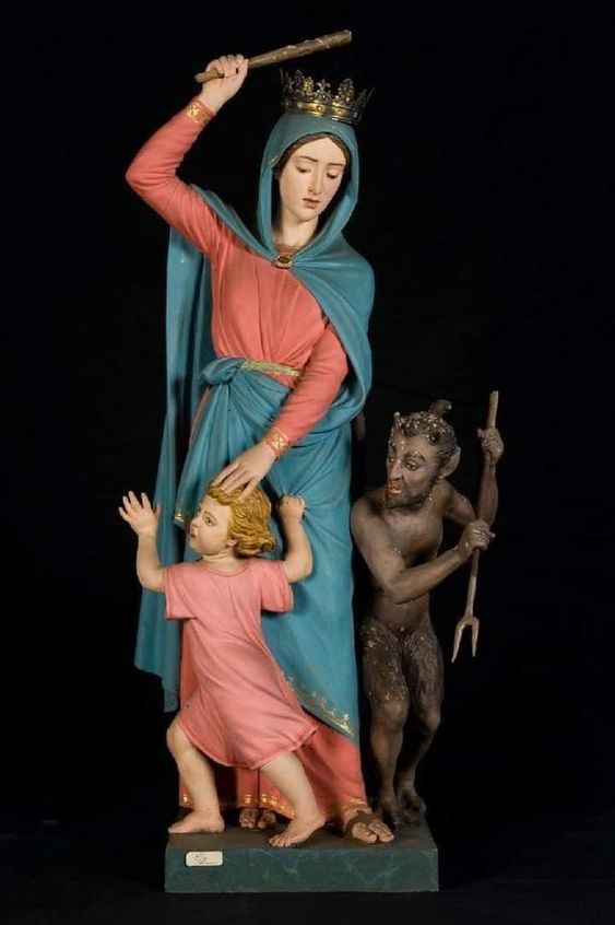 Estas representaciones de la Virgen portando una espada, un bastón, una lanza o un látigo no son solamente vestigios de un pasado cristiano guerrero. Son, sobre todo, apelaciones espirituales, para transmitir a los fieles que ella, como madre nuestra, siempre está vigilante para rechazar a quien nos haga daño, como haría cualquier madre, tan capaz de ofrecer la ternura de su abrazo a sus hijos como la energía más extrema ante quien pretenda herirlos. Como el Padre de la Mentira, que aspira a arrebatárselos todos, el agresor mahomentano. O en nuestros días el malo que intenta trasmitirles ideologías perversas a los niños para degenerarlos.