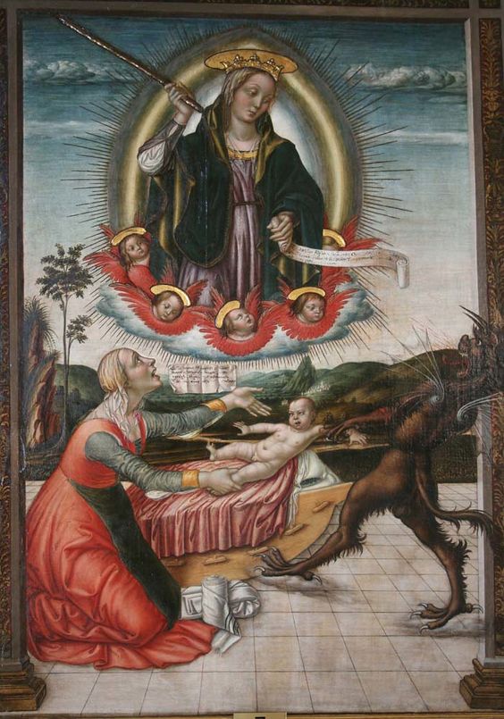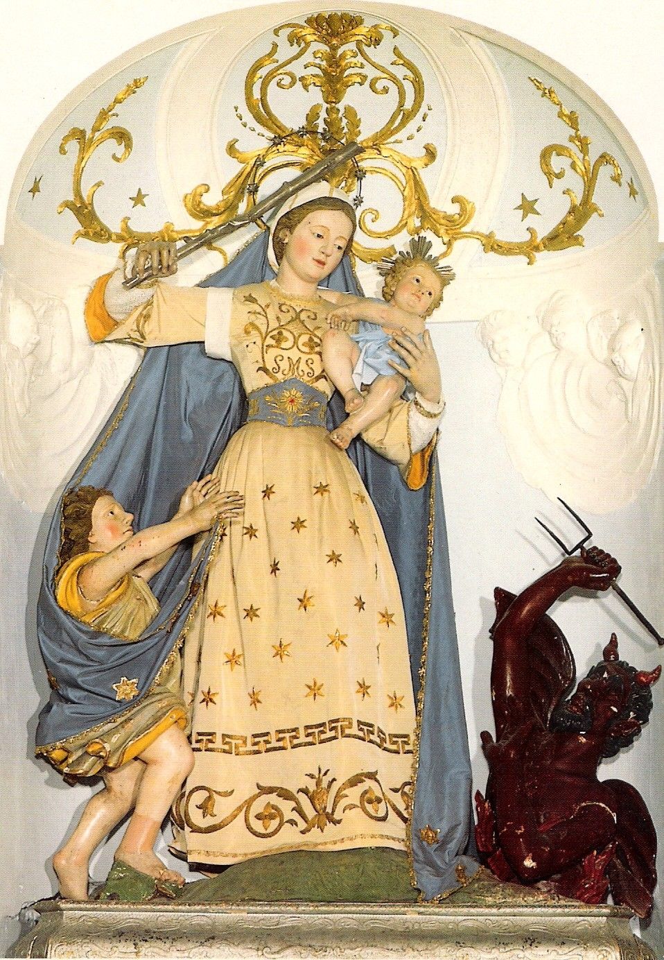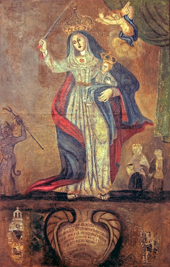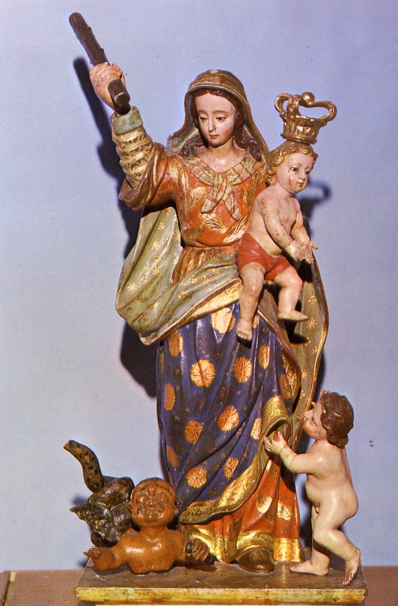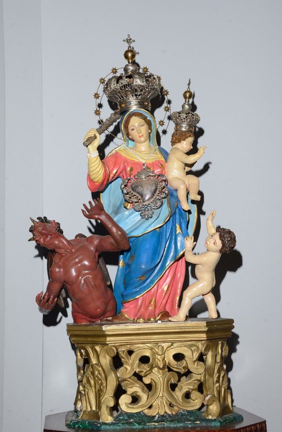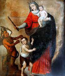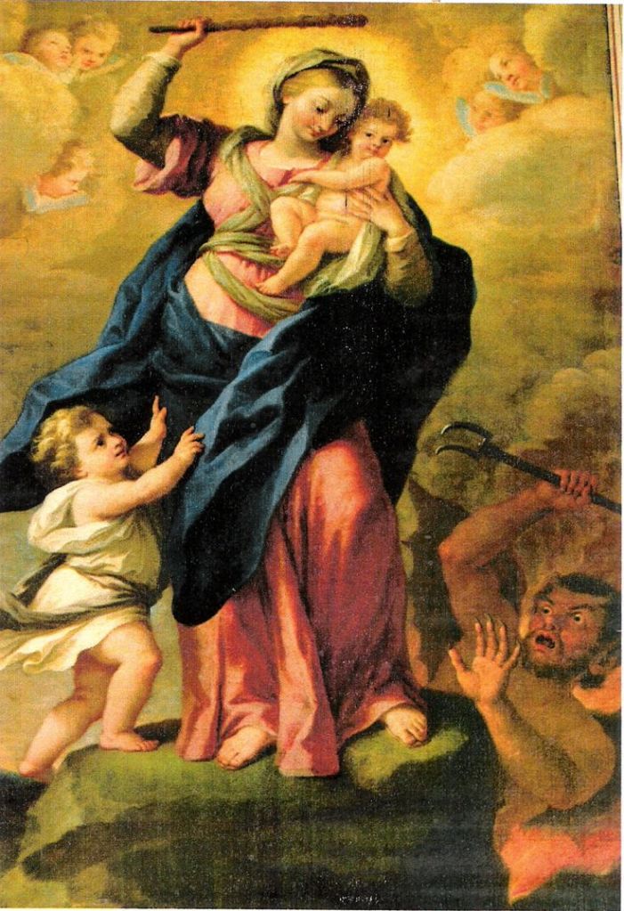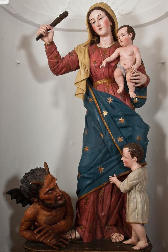 El Niño, indiferente de lo que ocurre juega con un angelito, mientras la Virgen, con dulce pero enérgico rostro, empuña un garrote para darle al infame Belcebú su merecido.