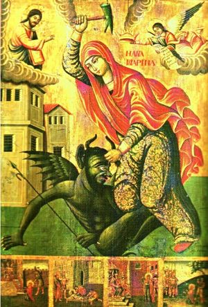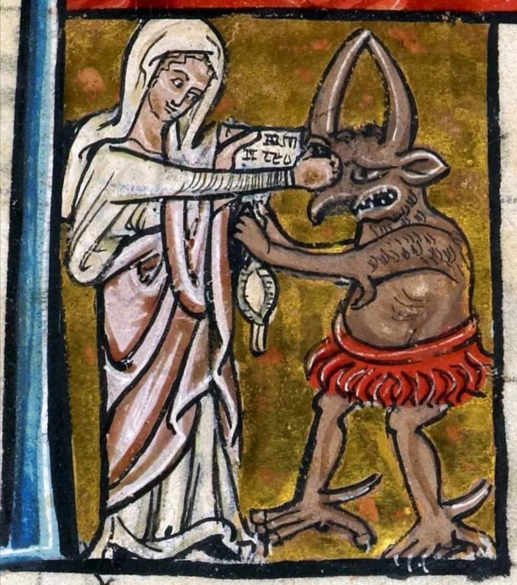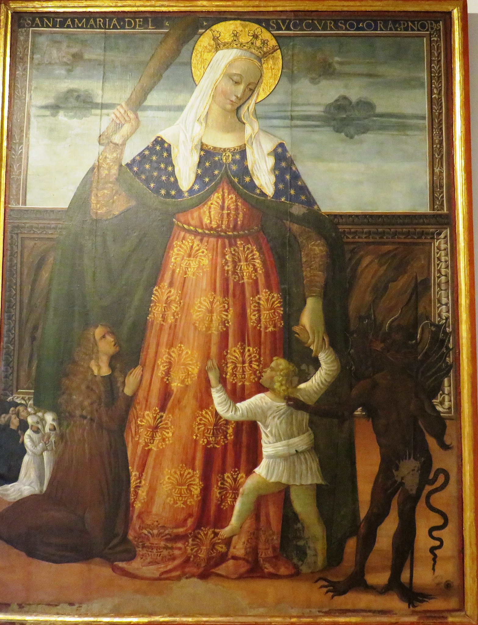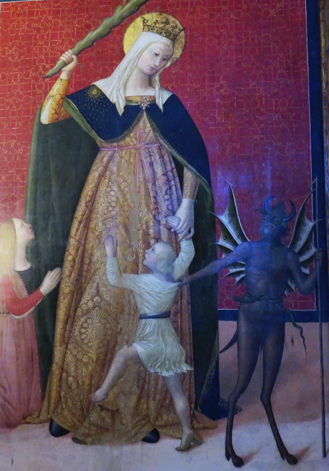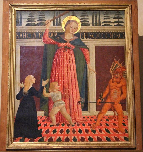 El Niño, indiferente de lo que ocurre juega con un angelito, mientras la Virgen, con dulce pero enérgico rostro, empuña un garrote para darle al infame Belcebú su merecido.