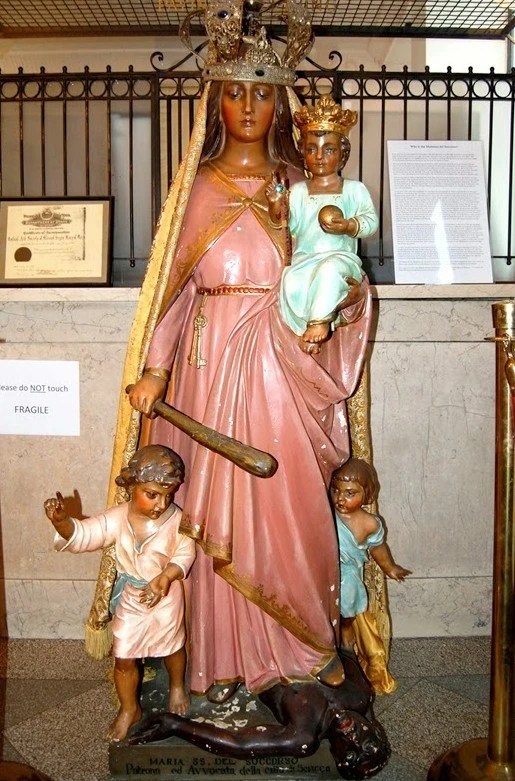 En 1306, Nuestra Señora se apareció a un monje agustino, Nicola la Bruna, quien gravemente enfermo estaba a punto de morir cuando fue curado milagrosamente por ella. A cambio, le pidió que difundiese la devoción de la Virgen del Socorro, blandiendo un arma contra el malo.