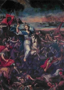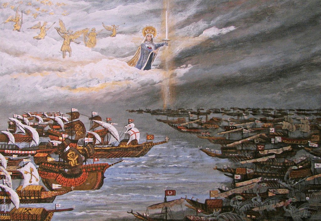 Numerosas representaciones de la batalla de Lepanto sitúan sobre la escena una imagen de la Santísima Virgen. Armada y dirigiendo los vientos de la Batalla.