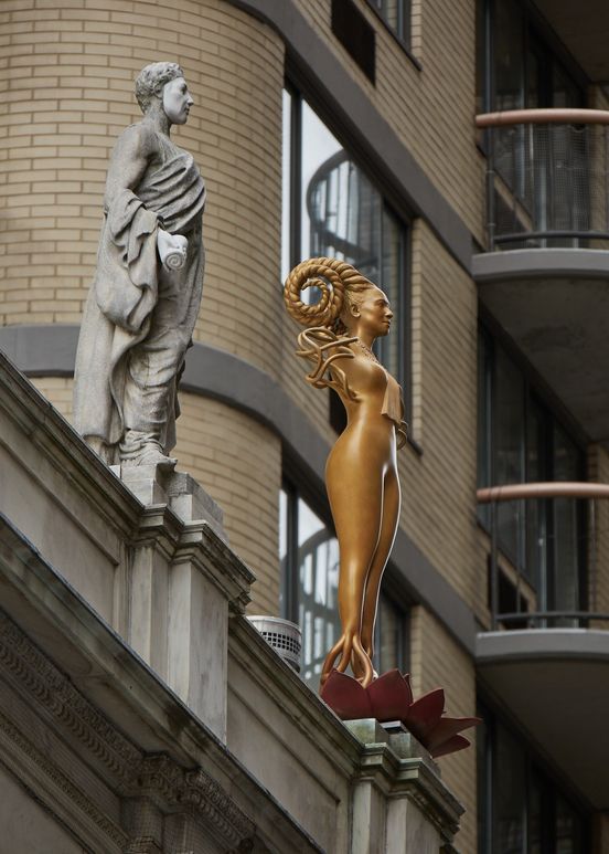 La estatua de una mujer con cuernos se instaló recientemente en lo alto del Tribunal de Apelación, Primer Departamento del Tribunal Supremo del Estado de Nueva York.