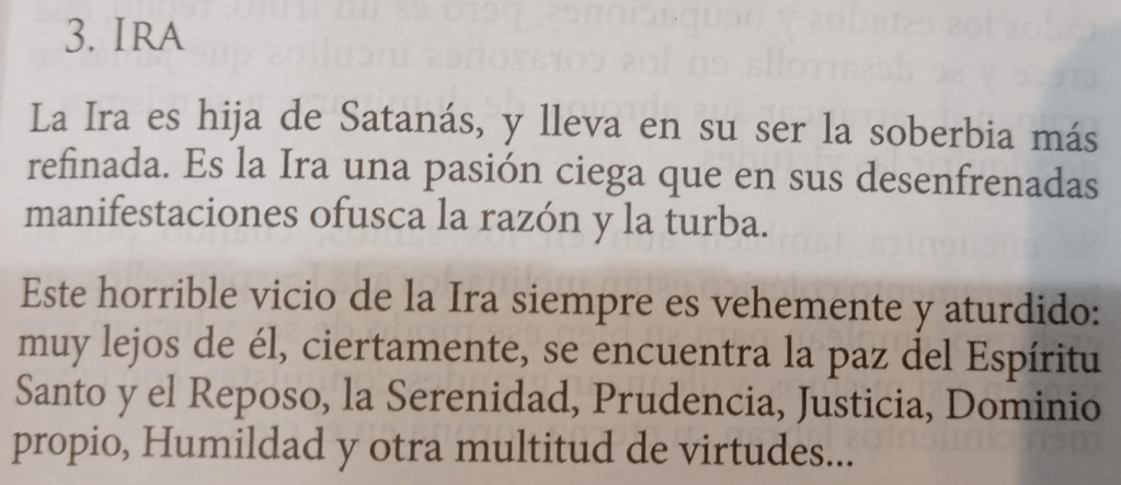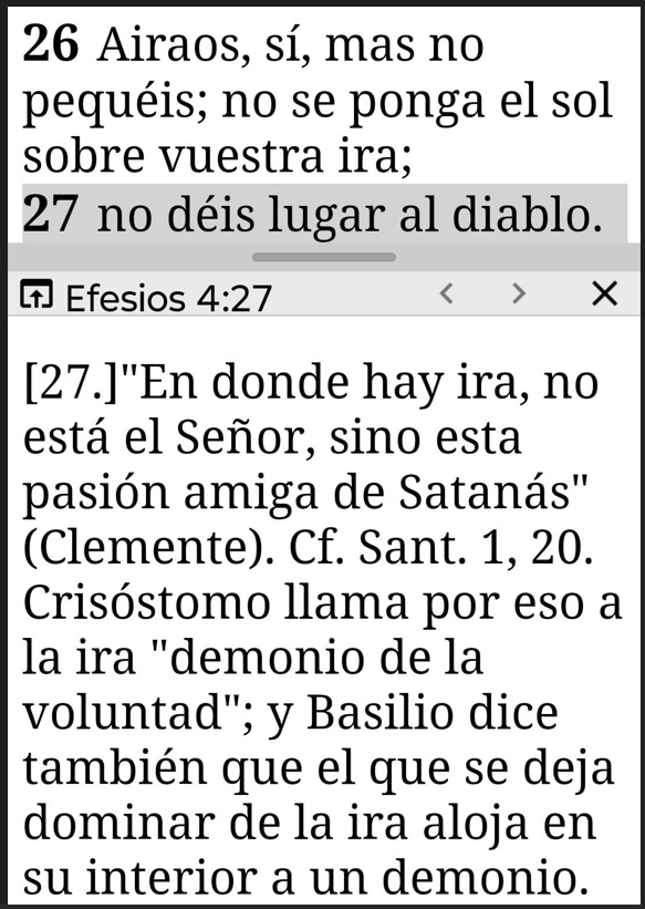 No se ponga el sol sobre vuestra ira. Aquí vemos que el acto primero de la cólera es una flaqueza inevitable de nuestra carne “y aún puede haber ocasiones en que una santa ira sea un deber”. Lo que San Pablo quiere es que no consintamos en esa mala tendencia de nuestra naturaleza caída. “En donde hay ira, no está el Señor, sino esta pasión amiga de Satanás”. San Crisóstomo llama por eso a la ira “demonio de la voluntad”; y San Basilio dice también que el que se deja dominar de la ira aloja en su interior a un demonio.