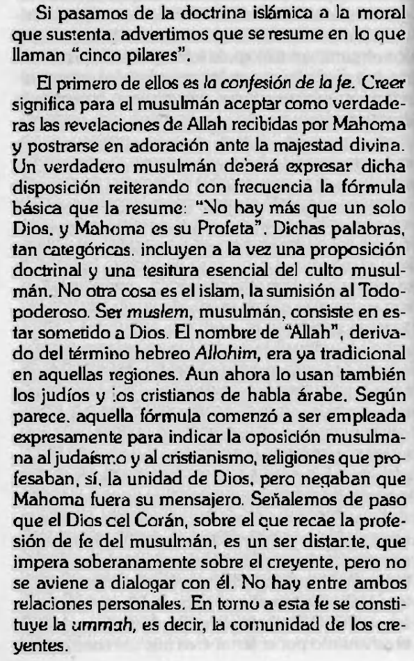 Sea lo que fuere de la precisión de esta censura teológica que los autores anteriormente citados atribuyen a la doctrina del islam, la cierto es que con su categórico rechazo de la Encarnación del Verbo, dicha doctrina se aparta sideralmente de la enseñanza cristiana. La negación a que acabamos de aludir involucra la impugnación del dogma de la Santísima Trinidad, así como de toda la estructura sacramental. Mahoma negó la Eucaristía, la Misa, el Orden sagrado, el matrimonio como sacramento. Es decir, hizo como todos los herejes, eligiendo algunas verdades, rechazando otras, «mutilando» la doctrina, con lo que la cosmovisión cristiana quedaba radicalmente simplificada. La doctrina de la Iglesia es verdadera -parecía decir- pero se ha llenado de excrecencias, se ha vuelto complicada por agregados arbitrarios de hechura humana. como por ejemplo la idea de que el fundador era divino, así como de que fuese imprescindible un estamento de sacerdotes e imaginarios sacramentos que conferían la gracia. A este respecto señala Belloc un paralelismo ente el entusiasmo con que Mahoma atacaba al clero, la Misa y los sacramentos y el fervor que. siglos después, exhibiría el calvinismo por enterrar esas mismas enseñanzas. Sigue pg 58