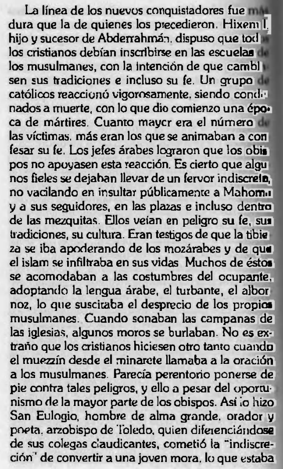 Los martirios provocados de los llamados mártires de Córdoba, liderados por San Eulogio, en una España, cada vez más islamizada y arabizada, muestran la reaccion de la iglesia contra este nuevo imperio que amenazaba el cristianismo.