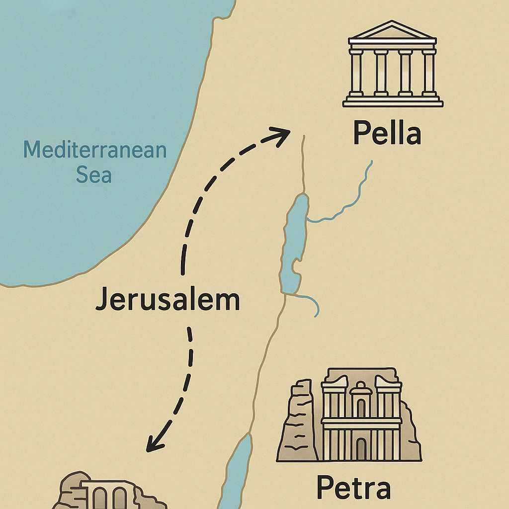 Se dirigieron a Pella, una ciudad de la Decápolis, en el valle del Jordán y otros principalmente a Petra, que está más al sur en Nabatea. Eusebio sugiere que toda la comunidad huyó. La línea de obispos cristianos continuó con líderes de origen judío durante varias generaciones, aunque después del 135 d.C. (tras la rebelión de Bar Kojba) los cristianos de origen gentil (no judíos) tomaron más poder.