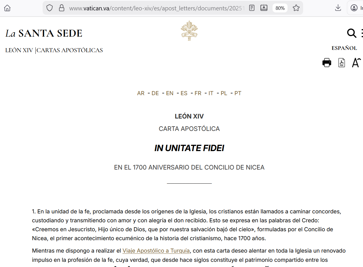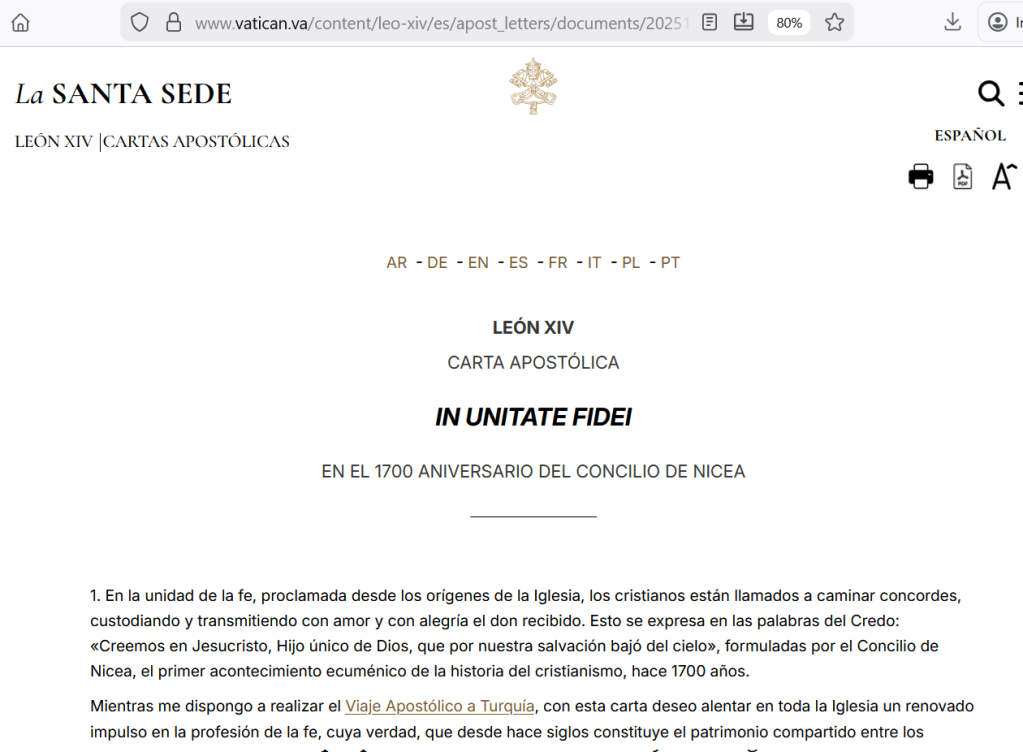 En la república Islámica de Turquía en noviembre 2025, en Estambul, antigua Constantinopla, o Bizancio, firmó con el Bartholomew I, patriarca Ecuménico, una declaración conjunta en la que reafirman su compromiso hacia la «unidad cristiana».